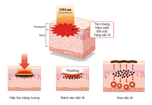 Laser sử dụng sóng laser tác động vào vùng da từ bề mặt da đến sâu bên trong lớp thượng bì, hạ bì; sóng này hấp thu sắc tố melanin làm giãn nở thành các hạt nhỏ li ti sau đó được cơ thể đào thải ra ngoài qua hệ thống bài tiết và đẩy lên bề mặt da, làm sạch tàn nhang chỉ sau khoảng 2 – 3 liệu trình.